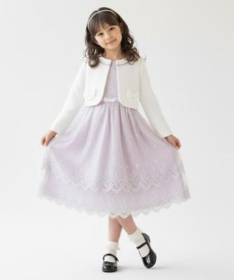 レースジャケットが華やかさを引き立てるワンピースセットで、これだけでフォーマルなコーディネートが完成します。襟元リボンは取り外し可能で、裾のスカラップや程よい透け感のジャケットと張り感のあるワンピースが上品な印象を演出します。